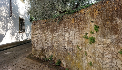 Percorrendo questa strada, specialmente nel suo tratto finale, verso il Forte, questi tipici muri di pietra e massi hanno qui una ancor più caratteristica particolarità, quella di essere intonacati e decorati con semplici e armoniose figure circolari, quadrate o a spirali; una varietà di graffiti, molti ancora originali, che riportano alla elegante semplicità contadina dei secoli passati.