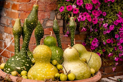 Bello il contrasto tra la composizione delle zucche gialle e verdi ed il colore "vivo" delle petunie. (personalmente, forse sbagliando, avrei cercato di scurire, sempre se si riuscisse, un pochino i mattoni per far risaltare ancora più le zucche)