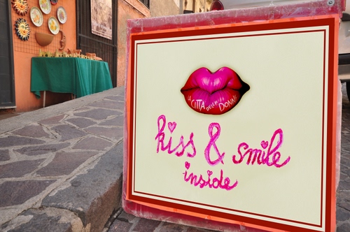 Corigliano Calabro - cartello creato con due mie foto: le labbra di un carro del Carnevale di Putignano e un cartoncino dove con i rossetti ho scritto kiss & smile inside