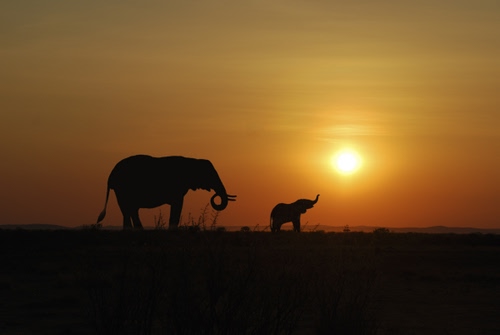 Tag: tramonto, elefanti, controluce, sole, savana, proboscide, elefante, due, animali, africa.