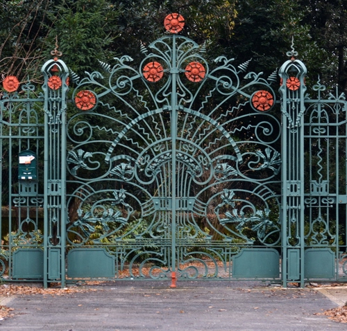 Tag: cancello, ferro, verde, rosso, alberi, fiori, strada, metallo, posta, ingresso, liberty, cerchi, cassetta.