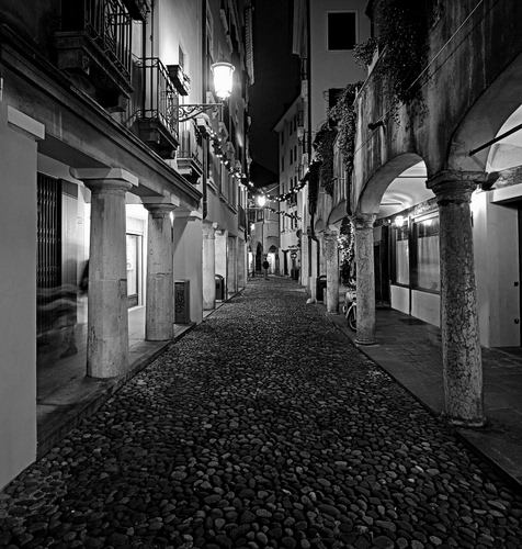 Tag: portici, colonne, lampione, notte, strada, archi, selciato, bianconero, vicolo, via, portico, notturno.