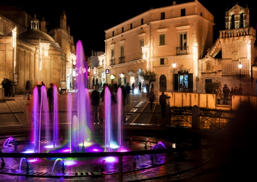 Tag: fontana, notte, viola, zampilli, luci, piazza, colori, palazzi, notturno, acqua.