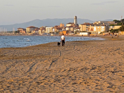 Tag: mare, sabbia, spiaggia, cane, campanile, borgo, uomo, onde, panorama, cielo, acqua, montagne, paese, case, paesaggio, passante, orme.