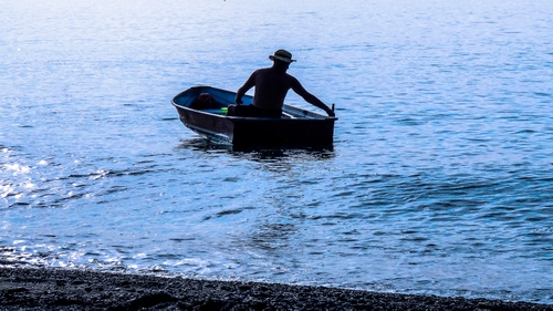 Mare Jonio un pescatore si avvia verso il largo per una pescata in solitario.