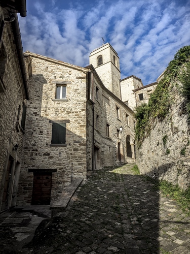 Tag: nuvole, cielo, case, finestre, salita, scorcio, torre, vicolo, borgo, pietre, strada, porte, azzurro, paese, piante, campanile, via, muro, mura, muri.