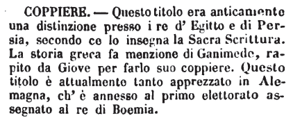 | Coppiere - Questo titolo era anticamente una distinzione presso i re d'Egitto e di Persia, secondo ce lo insegna la Sacra Scrittura. La storia greca fa menzione di Ganimede, rapito da Giove per farlo suo coppiere. Questo titolo è attualmente tanto apprezzato in Alemagna, ch'è annesso al primo elettorato assegnato al re di Boemia. [immagine] |